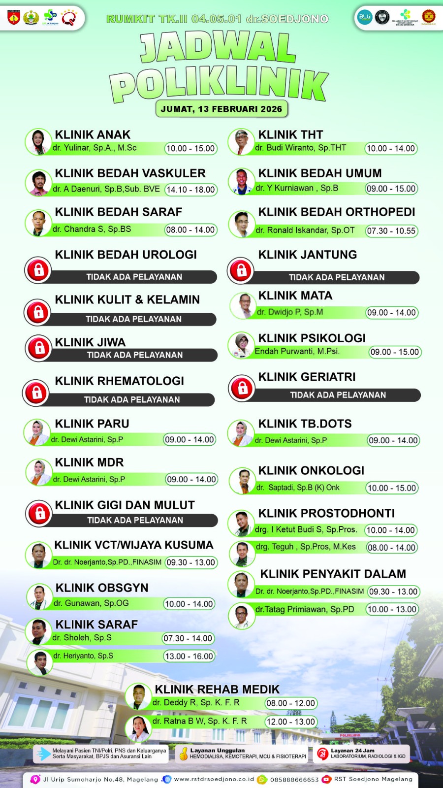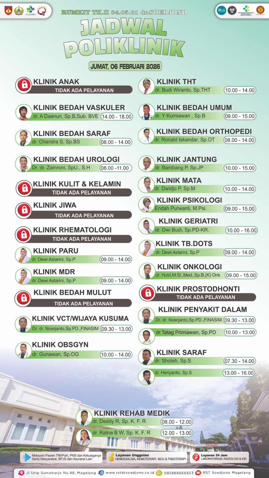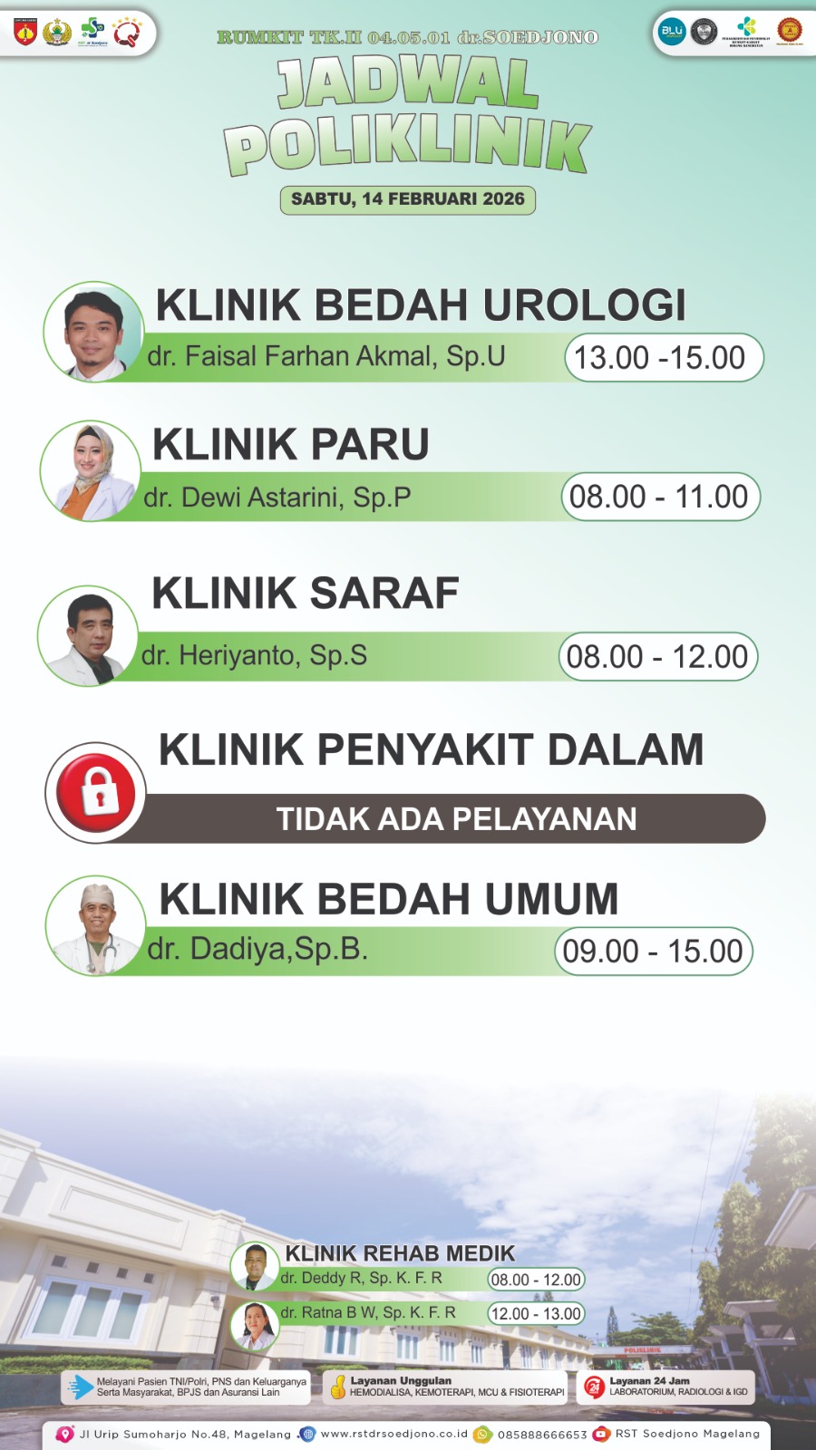 Kami melayani pasien dengan metode pembayaran pribadi serta jaminan perusahaan, asuransi, atau BPJS. RST dr. Soedjono memberikan pelayanan dengan teknologi dan mutu yang baik dan siap memberikan solusi kesehatan bagi masyarakat.