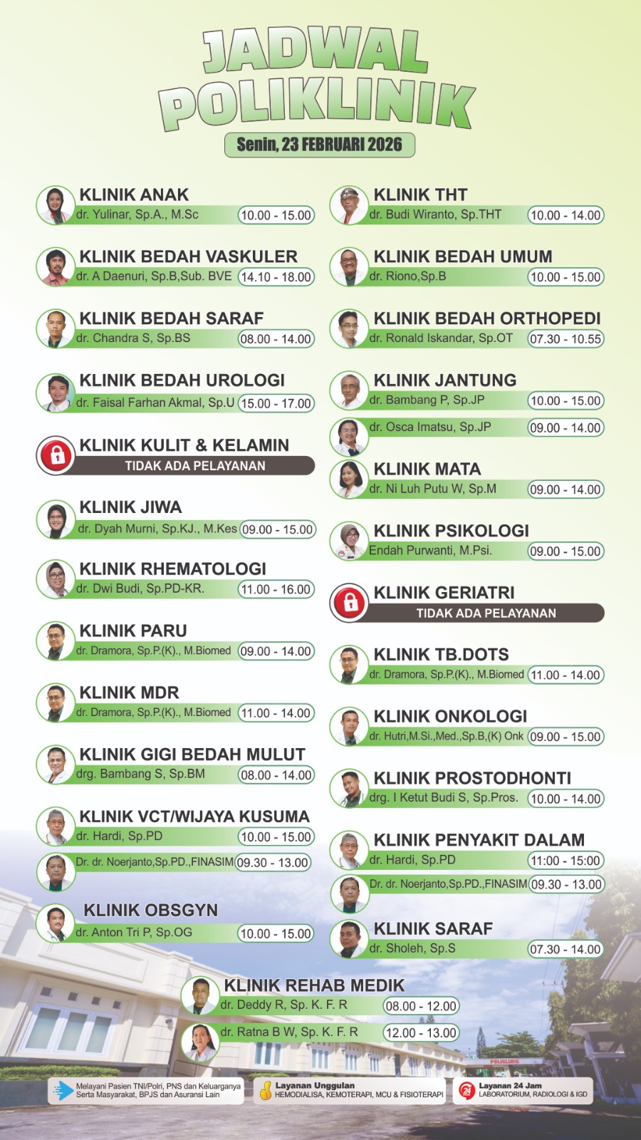 Dokter-dokter kami adalah tenaga medis berkompeten dan berpengalaman, yang siap memberikan perawatan terbaik dengan pendekatan yang penuh perhatian. Dengan berbagai spesialisasi, kami memastikan setiap pasien mendapatkan penanganan yang tepat dan berkualitas.