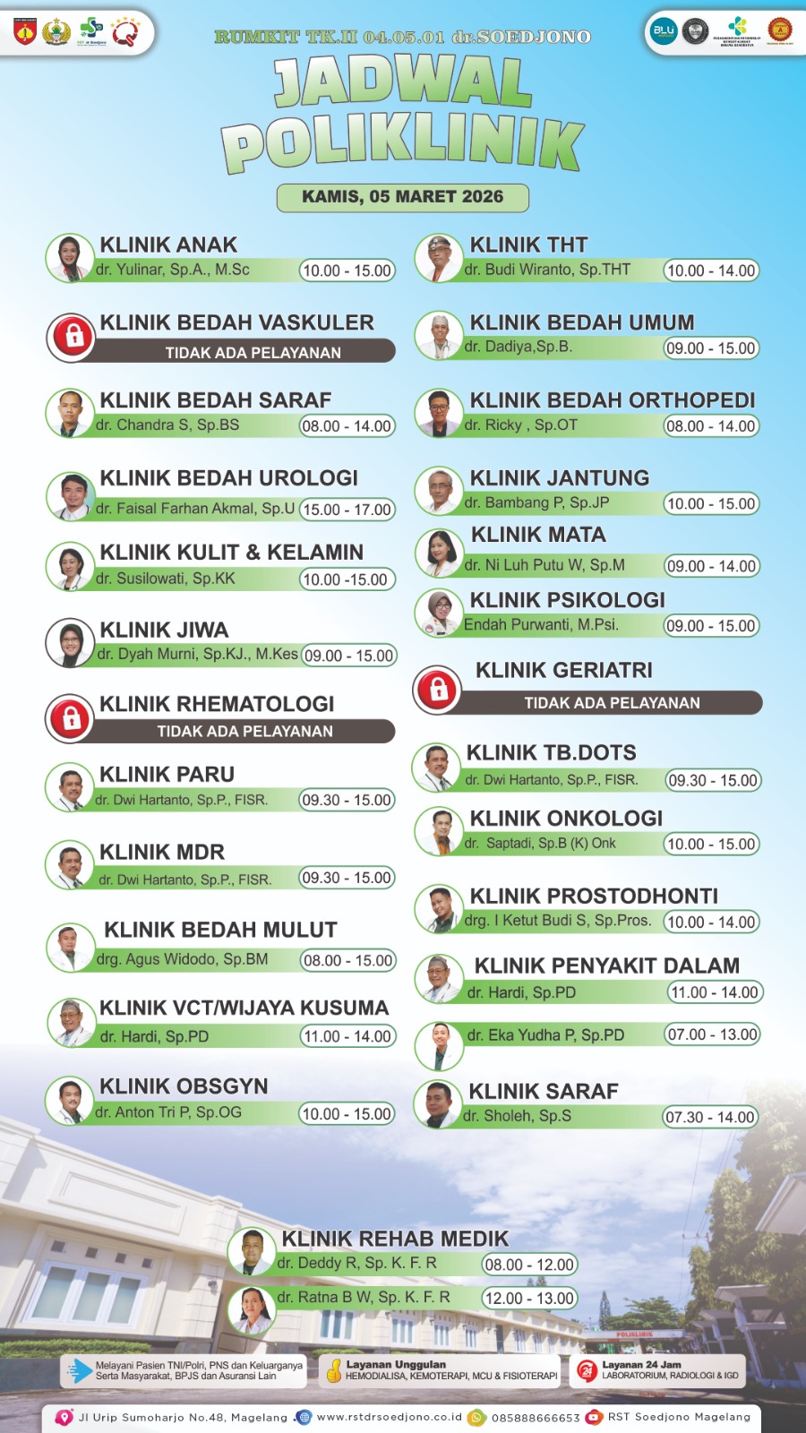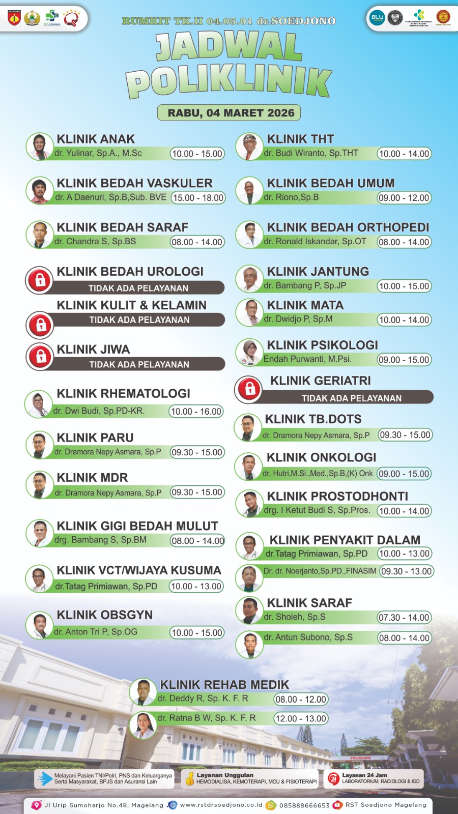 RST dr. Soedjono memberikan pelayanan yang prima dengan mengutamakan mutu keselamatan dan keamanan pasien yang tercermin dengan telah terakreditasinya RST dr. Soedjono di tingkat nasional oleh Komisi Akreditasi Rumah Sakit (KARS).