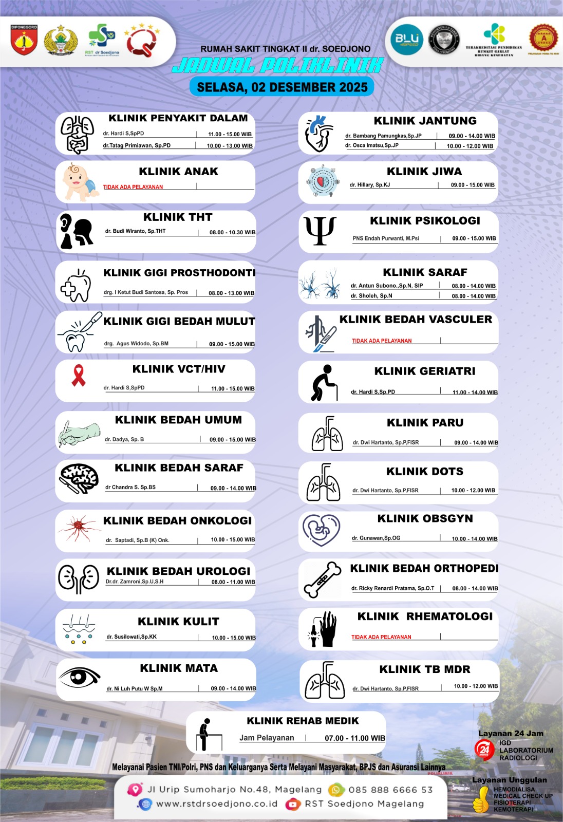 RST dr. Soedjono memberikan pelayanan yang prima dengan mengutamakan mutu keselamatan dan keamanan pasien yang tercermin dengan telah terakreditasinya RST dr. Soedjono di tingkat nasional oleh Komisi Akreditasi Rumah Sakit (KARS).