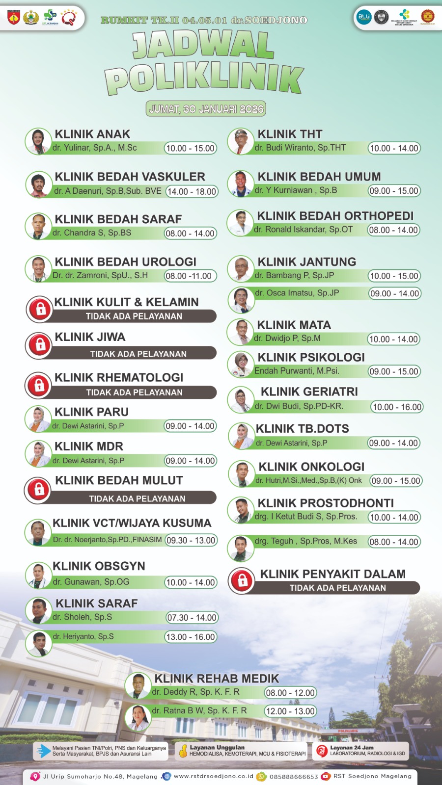 Kami melayani pasien dengan metode pembayaran pribadi serta jaminan perusahaan, asuransi, atau BPJS. RST dr. Soedjono memberikan pelayanan dengan teknologi dan mutu yang baik dan siap memberikan solusi kesehatan bagi masyarakat.
